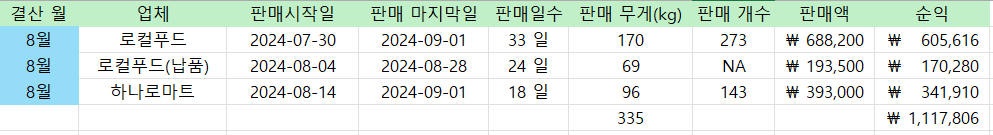 9월에는 더 많이 판매할 예정이고 우선 순익을 150만원을 목표로 하고 있습니다. 또한 한달간의 매출 데이터를 활용해서 대파를 구매의 특성을 알아볼 예정입니다. 매일 파 작업을 하는 것은 매우 비효율적이기 때문에 2일 단위로 포장을 할 수 있도록 데이터를 분석해서 판매량을 예측하는 프로젝트를 진행할 계획입니다. 많은 양을 출하해보니 3일정도의 기간이 지나니 파의 상태가 안좋아져서 오히려 수거를 해야하는 상황이였습니다. 그래서 프로젝트를 진행해서 예측량을 정확히 파악해서 작업을 하는데 활용할 예정입니다.