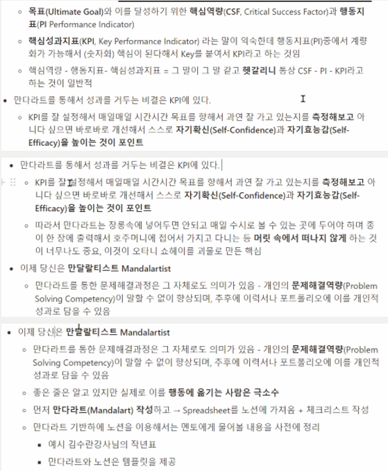 저는 3월부터 시간을 관리하며 살고 있는 학생입니다. 어느 덧 7월이 찾아왔고 취업이라는 길이 멀지 않게 느껴집니다. 취업에 대한 압박감을 느끼기도 하고 조급한 마음이 없다고 하면 거짓말 일 것입니다. 하지만 저는 오늘 취업을 위해서 무언가를 하는 것이 아닌 가치있는 삶을 살기 위해서 앞으로를 살고 싶다고 생각했습니다. 그리고 저는 오늘 만다라트 강의를 통해서 목표가 생겼습니다. '나'라는 사람을 굳이 설명하지 않아도, 어떤 사람인지 만다라트를 보고 머릿속에서 그려질 수 있는 사람이 되고 싶습니다. 많이 부족하지만 강의를 마치고 지금까지 쉬지않고 앞으로의 삶을 고민하며 계획할 수 있었던 뜻 깊은 시간이였습니다. 좋은 강의를 해주셔서 감사합니다. 잘 활용해서 가치있는 사람이 되겠습니다.
