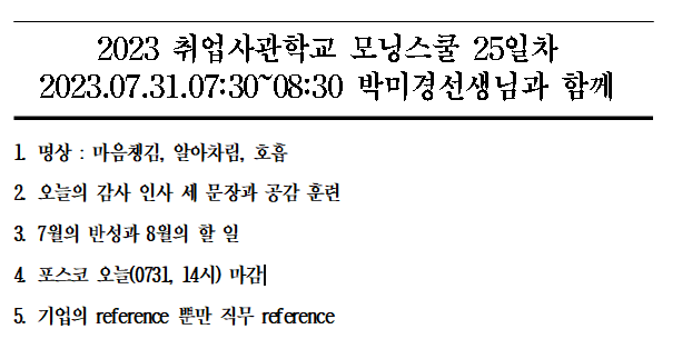 | [모닝스쿨] 24일차(23.07.24) (0) | 2023.07.24 |