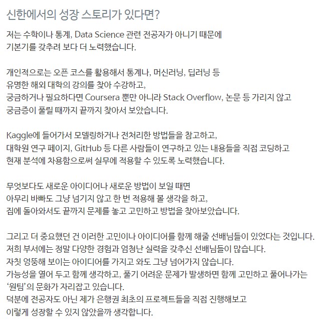 전공자도 아니였지만 은행권 최초의 프로젝트를 직접 진행해보고 꾸준히 생각하고 방법을 찾으며 고민을 했다는 것이다.