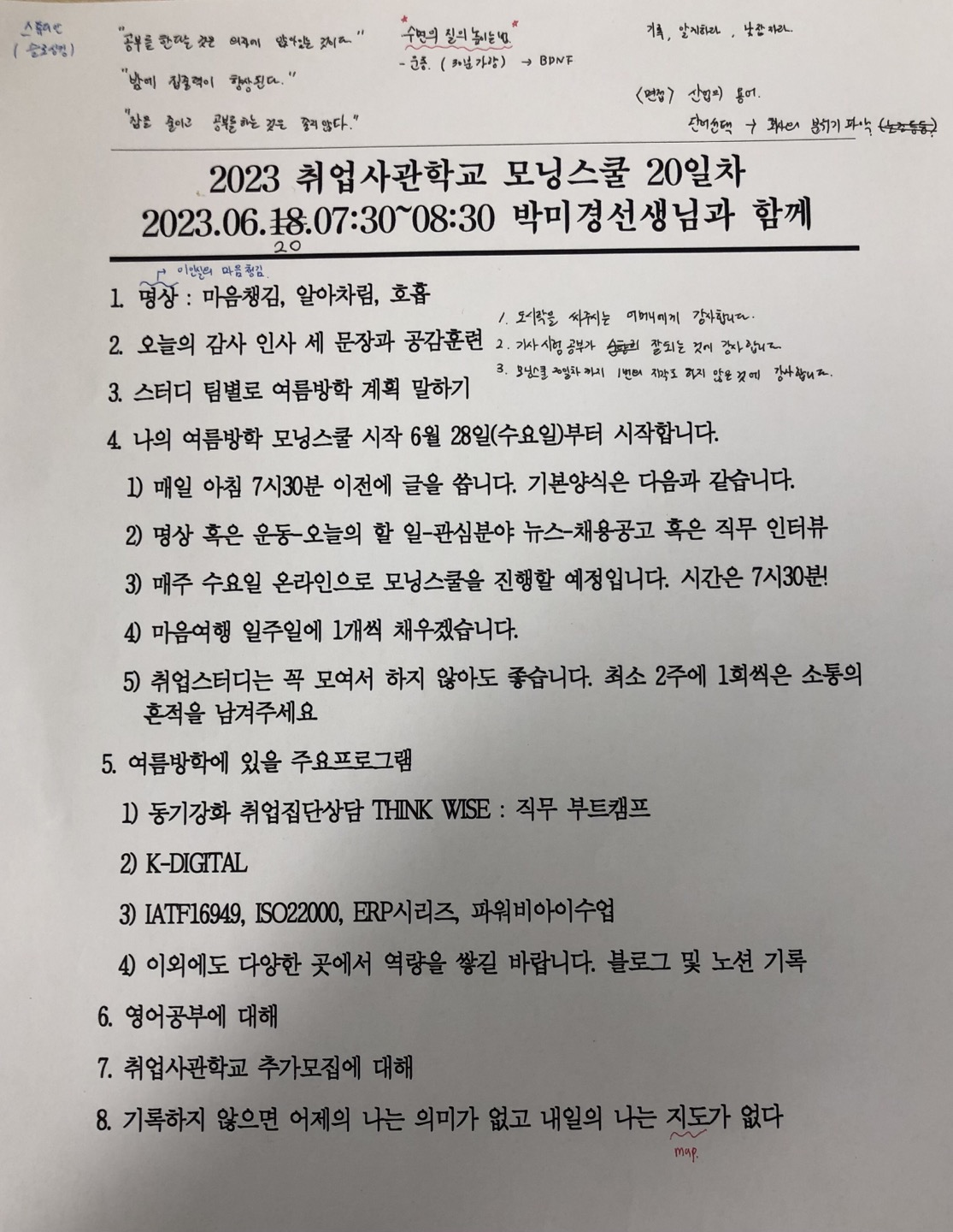[모닝스쿨] 20일차(23.06.20) - '기록하지 않으면 어제의 나는 의미가 없고, 내일의 나는 지도(map)가 없다' 본문