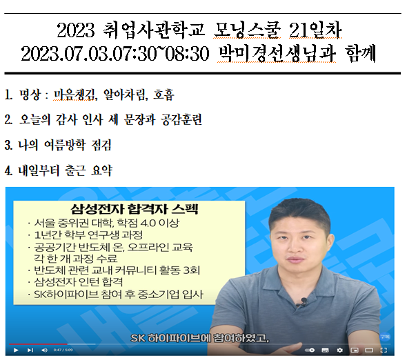 | [모닝스쿨] 20일차(23.06.20) - '기록하지 않으면 어제의 나는 의미가 없고, 내일의 나는 지도(map)가 없다' (0) | 2023.06.20 |