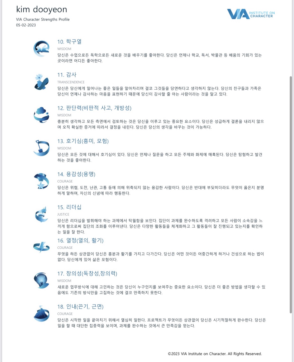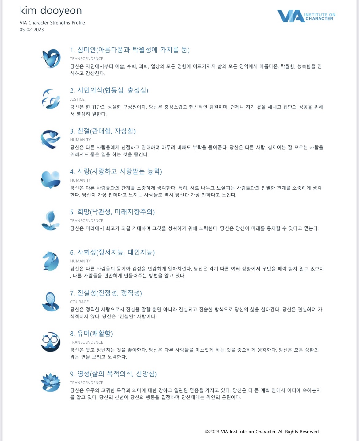 이러한 가치관을 가지고 있어서 1~7위까지 강점이 나타났다고 생각한다.
