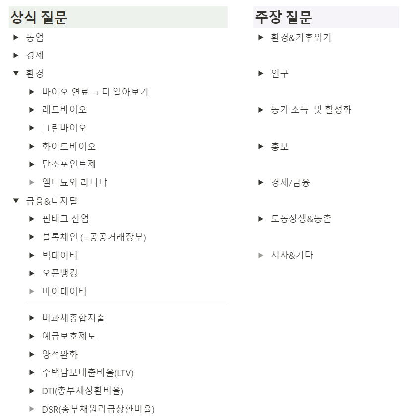 상식질문의 경우 금융,경제,농업,환경 등 다양한 부분을 물어보기 때문에 노션에 카테고리별로 상식들을 정리하는 연습을 했습니다.