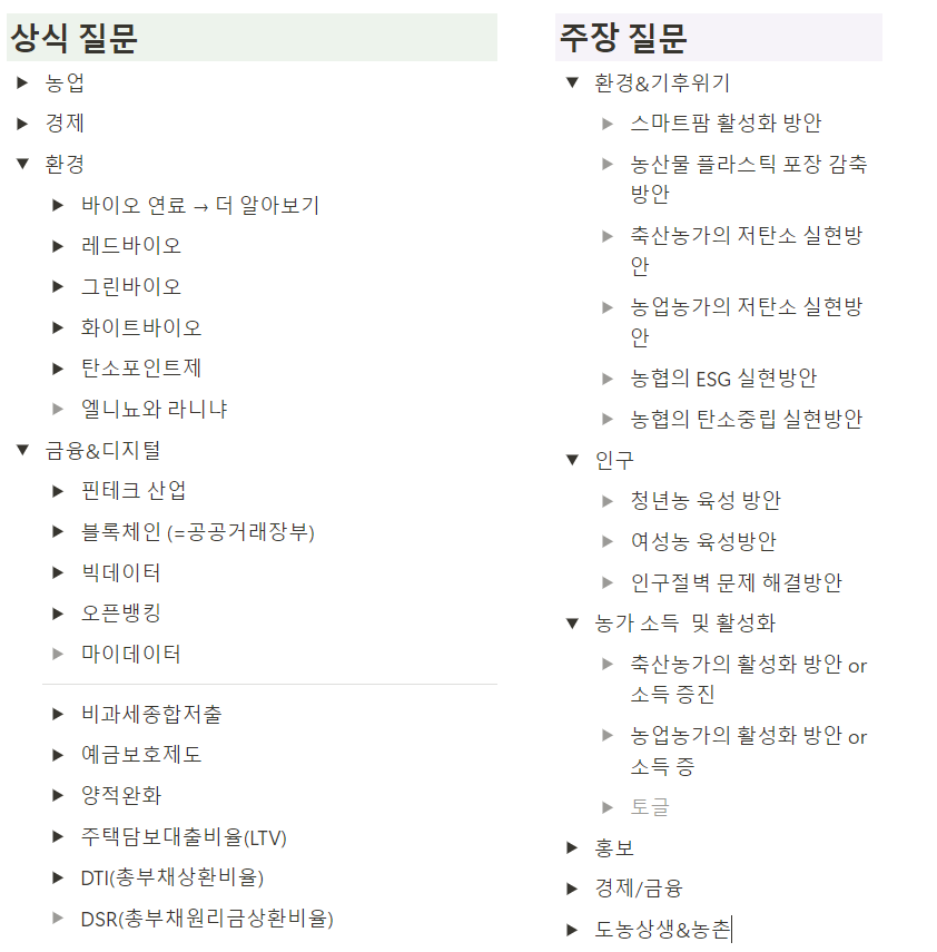 그래서 현재까지 나온 주제들로 카테고리를 만들어서 어떤 주장질문이 나와도 대답을 할 수 있도록 연습을 했습니다.