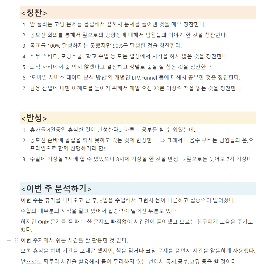 내가 성장하기 위한 환경을 만들기 위해서 필수적인 요소이며 '나'를 되돌아보는 것에 대한 중요성을 느꼈다.