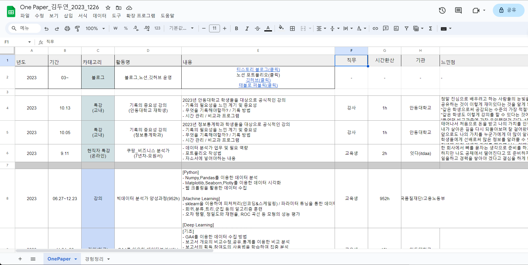 내가 경험한 것들 잘 정리해야하는 것을 느꼈다. 원페이퍼에 나의 4년간 생활에서 무엇을 했는지 느낀점은 무엇이였는지 어떤 에피소드가 있는지 정리했다.자소서에 잘 녹여낼 수 있도록 평소에 잘 정리하자
