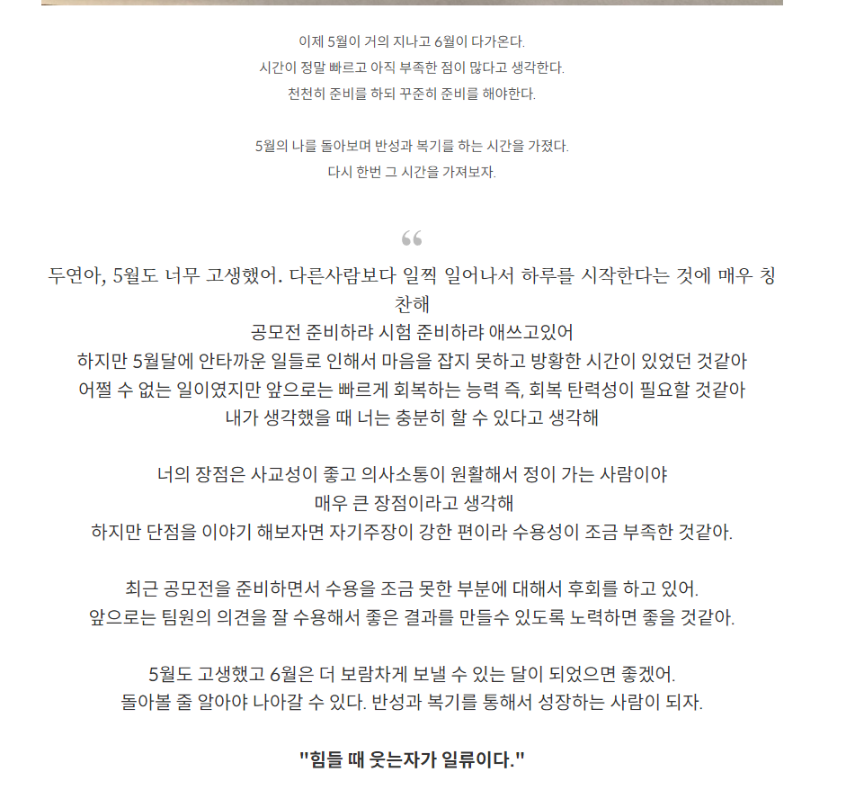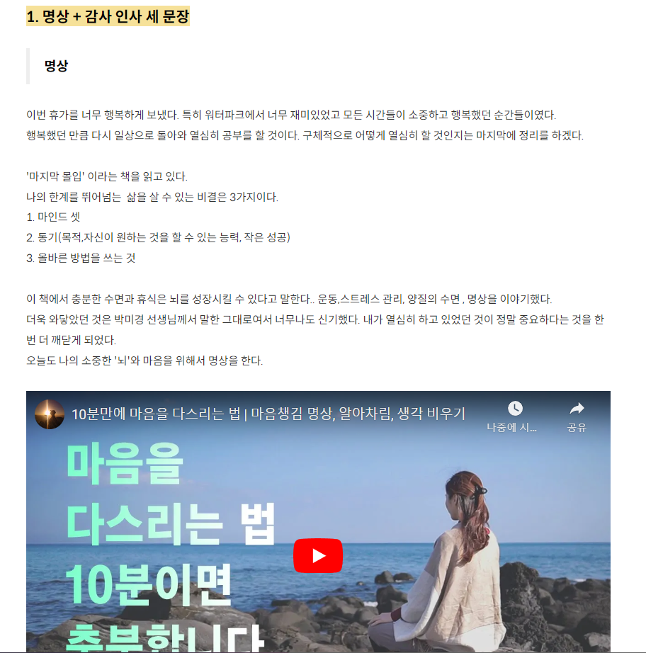 내가 영상을 보거나 무언가를 했다며 그것을 토대로 내가 무엇을 깨달았고 내 삶에 어떻게 적용할 수 있는지 적어보는 것이다. 인지를 하고 내 삶에 적용하려고 하는 노력은 내가 꾸준히 성장할 수 있는 방법이였다.