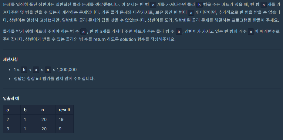 | [프로그래머스Lv.1] 콜라 문제(Python) (0) | 2023.08.10 |