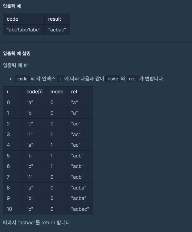 2. 조건문을 활용하여 code의 길이만큼 code의 인덱스를 사용하여 새로운 조건문을 이용해 mode = 0와 아닐 때를 구분해준다.