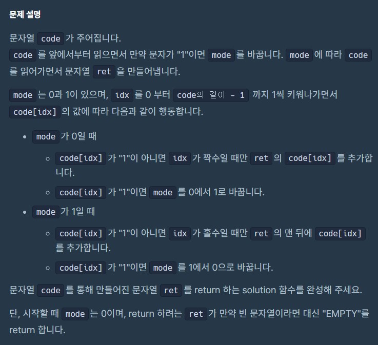 code라는 변수에 문자열이 저장되어 있고 그 문자열을 mode가 0,1에 따라서 ret에 저장하는 방식이 다르다고 생각하면 된다. 시작할 때 mode는 0 이고 만약 return하려는 ret의 문자열이 비어 있다면 'EMPTY'를 반환하면 된다.