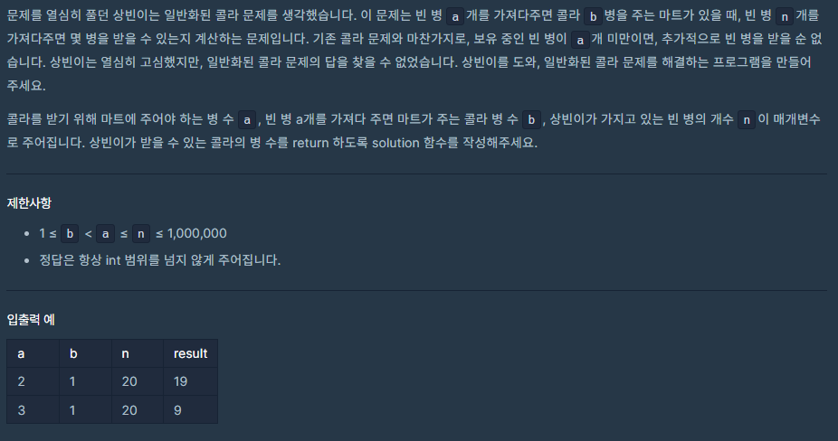 [프로그래머스Lv.1] 콜라 문제(Python)