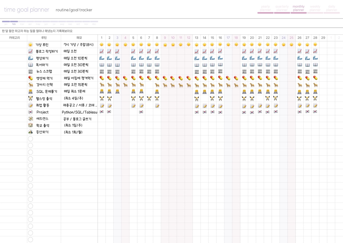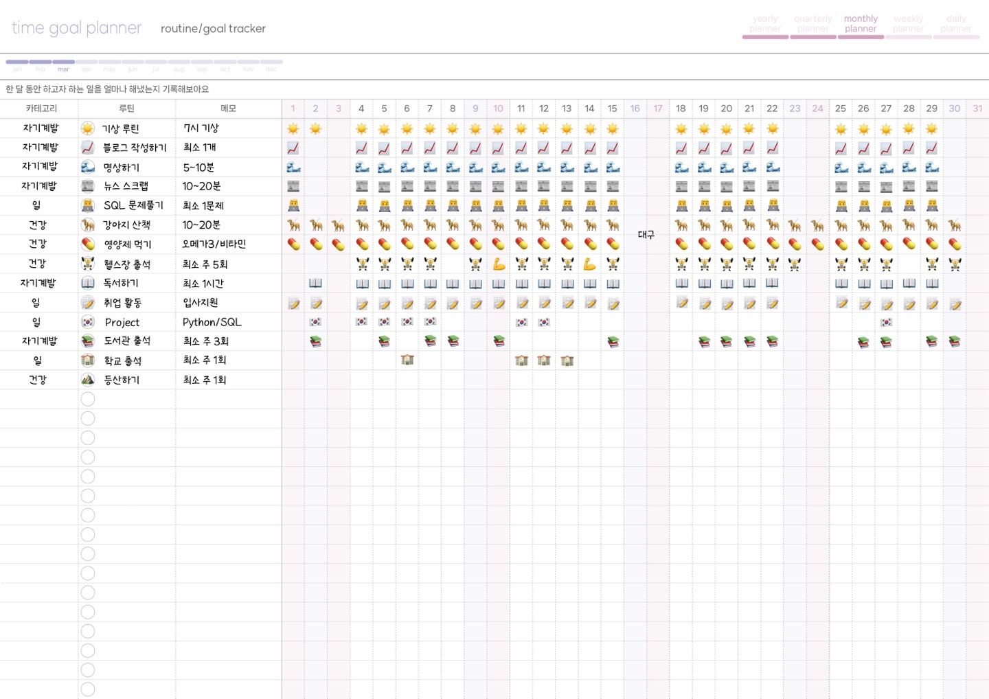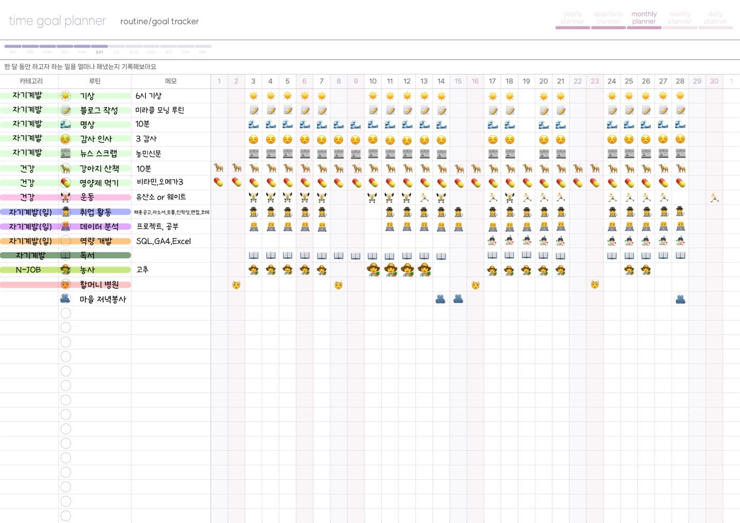 | 자기계발 | 미라클 모닝 루틴(명상,독서,뉴스,..) | 6시 기상 | 달성 |