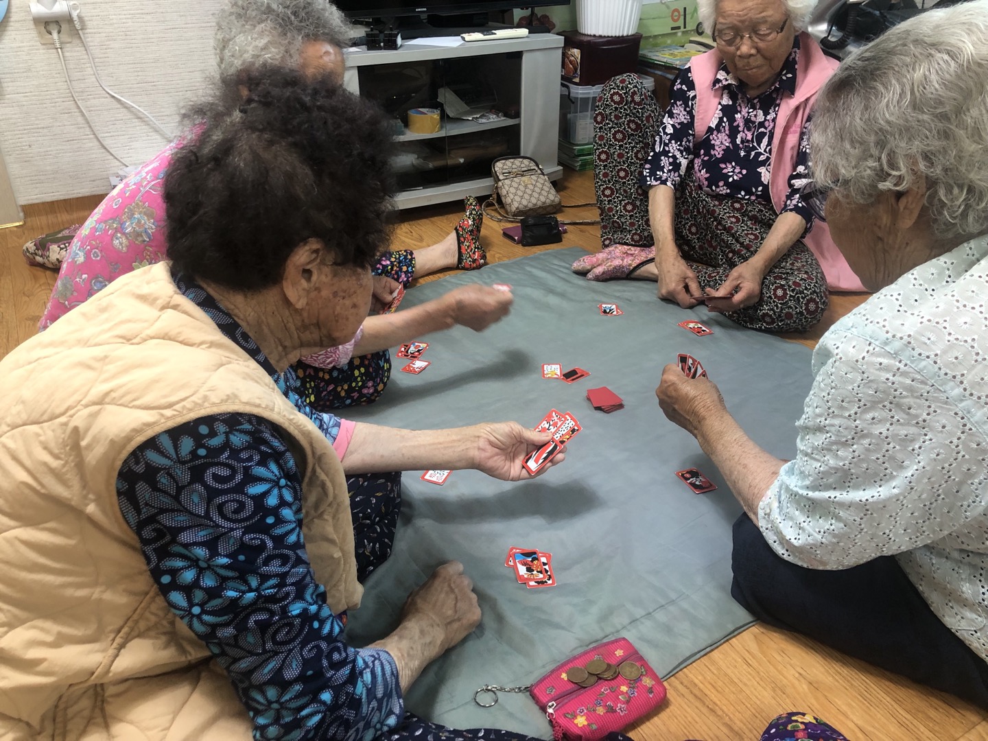 할머니들의 건강도 살피고 같이 화투 구경을 하면서 어르신들과 함께 하는 시간을 가지면서 힐링을 합니다