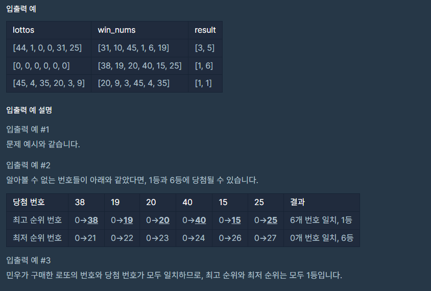 먼저 모두 0인 경우에는 set()과 len()를 이용해서 [1,6]을 반환하고, 0이 없는 경우에는 [result,result]를 반환하도록 만들었다. 나머지의 경우에는 [result-plus,result]로 반환을 하게 했다.