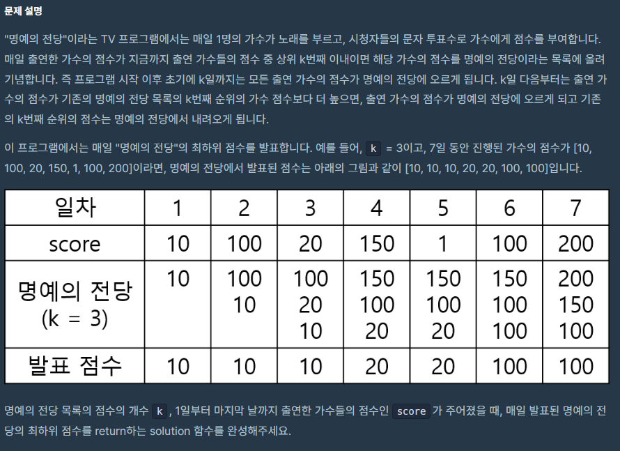 나는 문제를 접근할 때 명예의 전당 k개 만큼까지는 마지막 인덱스를 리스트에 저장하고,