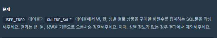 문제 : 년,월,성별 별 상품 구매 회원 수 구하기