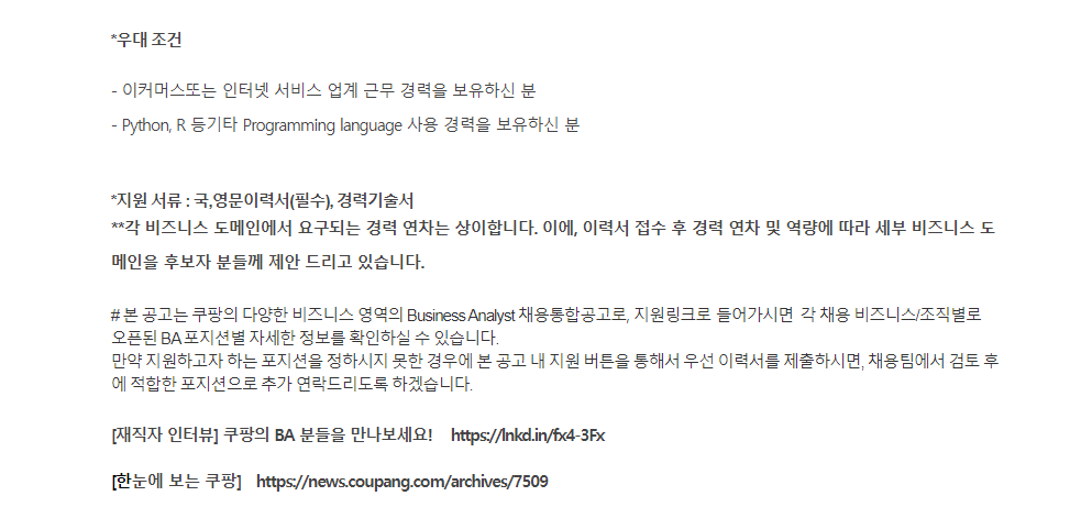 쿠팡(주), [쿠팡] Business Analyst (비즈니스 데이터 분석) 경력자, 경력:경력 5~18년, 학력:대학교졸업(4년)이상, 연봉:면접 후 결정 , 마감일:채용시, 홈페이지:www.coupang.com