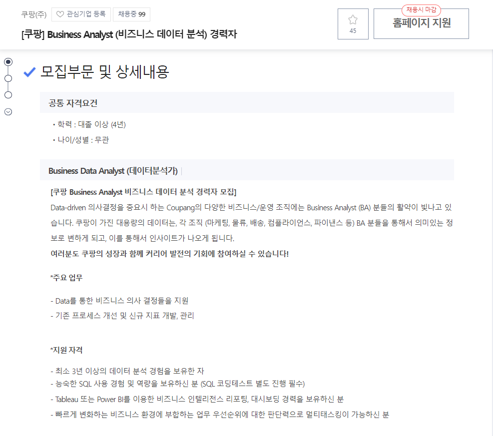 [쿠팡(주)] [쿠팡] Business Analyst (비즈니스 데이터 분석) 경력자(채용시 마감) - 사람인