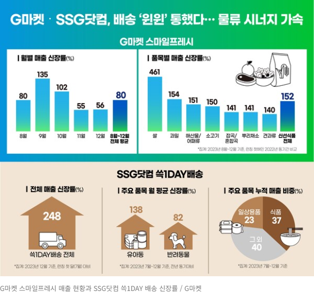 신세계그룹의 온라인 유통채널 G마켓과 SSG닷컴이 각 사의 노하우를 전수하고 지원한 것이 2023년 물류 서비스 영역에서 시너지 효과를 냈다. G마켓의 장보기 서비스 '스마일프레시'는 SSG 닷컴의 쓱배송과 새벽배송을 통해 제공하는 온라인 장보기 서비스이다. 2023년 8월부터 12월까지의 스마일프레시 매출은 론칭 첫해보다 80%증가했다.