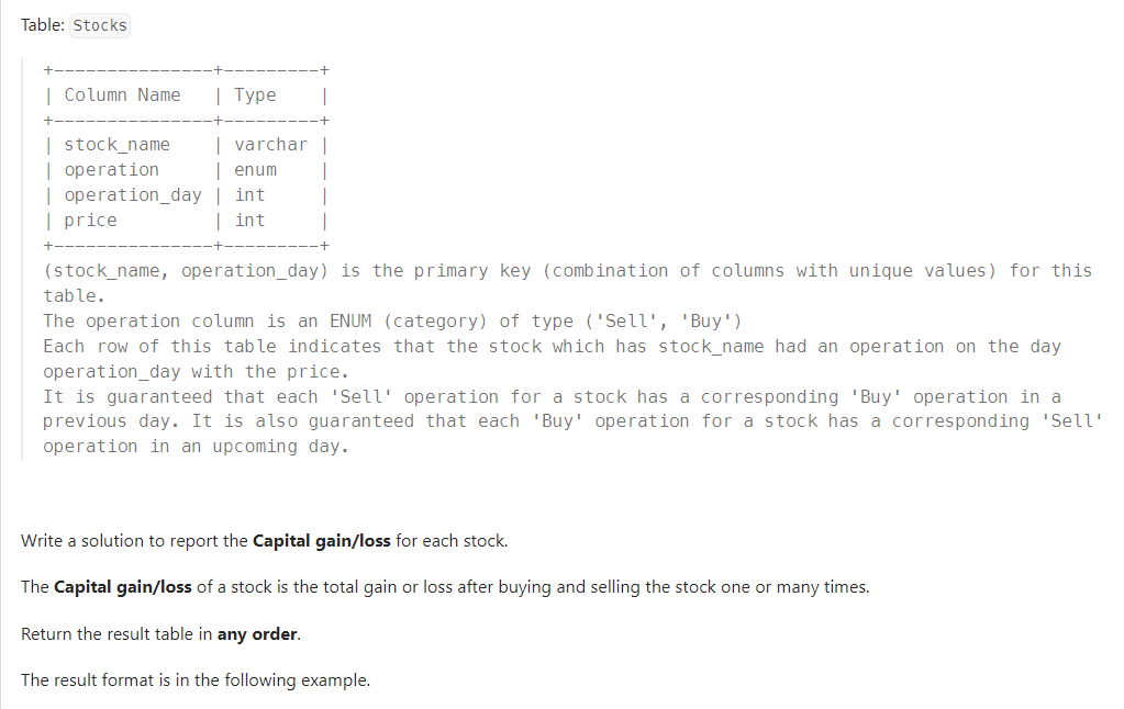 , SUM(CASE WHEN operation = 'Sell' then price ELSE -price END) as capital_gain_loss
