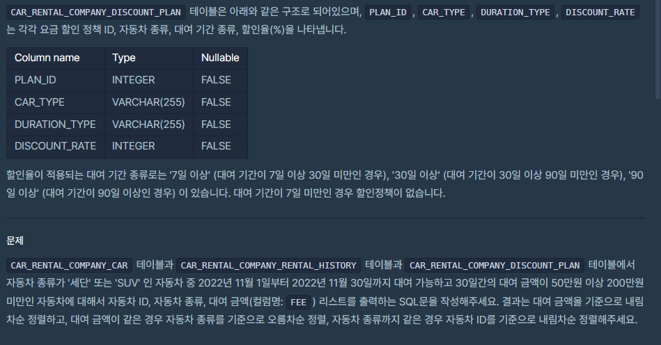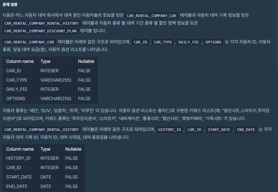 문제 : 특정 기간동안 대여 가능한 자동들의 대여비용 구하