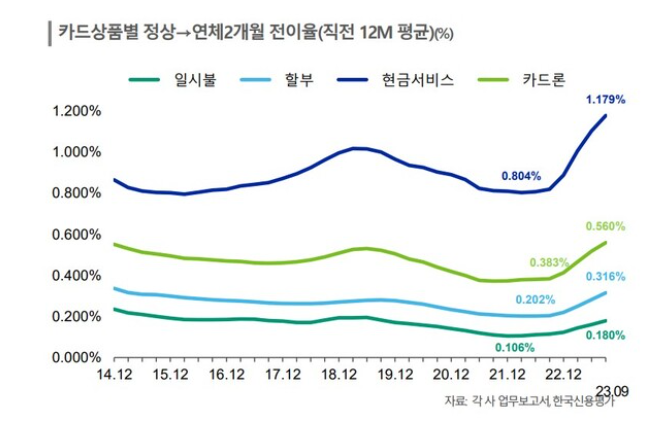 카드사 연체율이 10년 간 최고치를 찍는 등, 카드 업계 전반에 위기 경고등이 들어왔다. 고금리 국면이 길어지면서 금융대출을 이용하는 사람들의 대출상환 여력도 떨어지고 있다는 분석이다.11