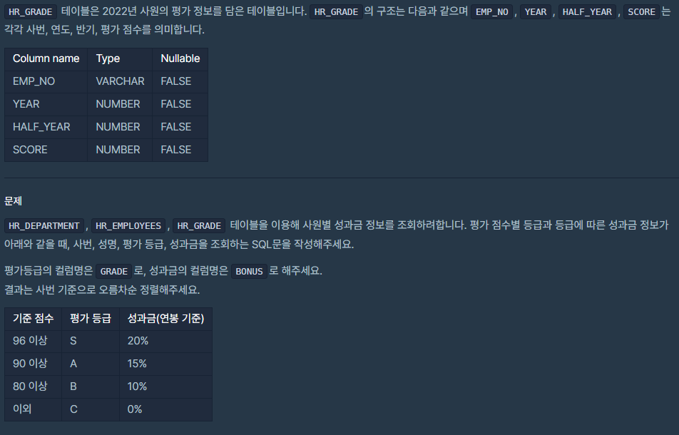 문제 : 연간 평가점수에 해당하는 평가 등급 및 성과금 조회하기