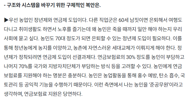 “농업·농촌이 발전하려면 현금을 지원하는 정책을 확대하기보다는 ‘구조와 시스템’을 바꾸는 데 힘써야 합니다. 이를 위해 남은 임기에 지방정부 차원에서 할 수 있는 일을 다해 대한민국