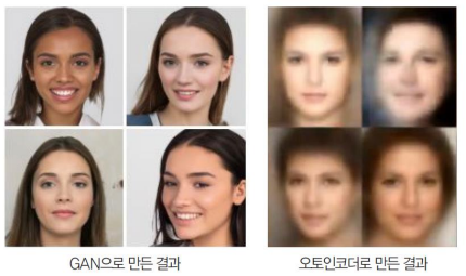 - 오토인코더 : 입력 데이터의 특징을 효율적으로 담아낸 이미지를 생성