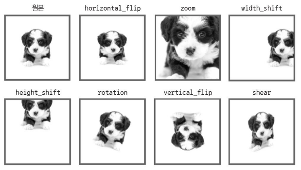 | width_shift, height_shift | 정해진 범위 안에서 그림을 수평 또는 수직으로 랜덤하게 평행 이동시킴 |