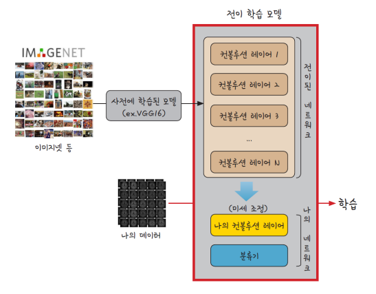 - 여러 방법 중에서 수 만장에 달하는 기존의 이미지에서학습한 정보를 가져와 내 프로젝트에 활용하는것