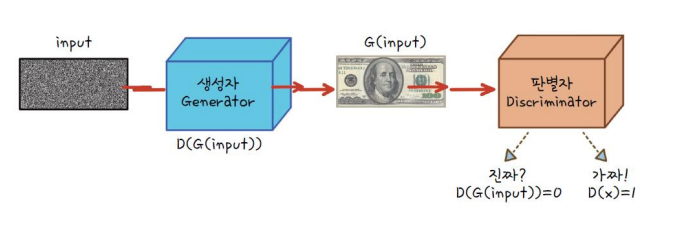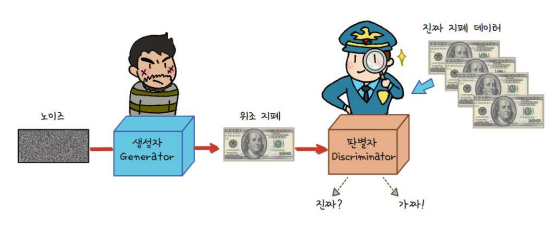 - 진짜 같은 가짜 이미지를 생성하기 위해 GAN 알고리즘 내부에서는‘적대적’인경합을 진행하기 때문임
