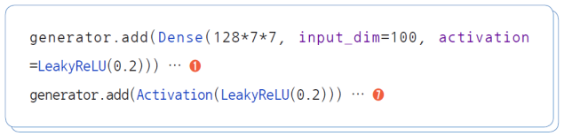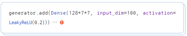 generator.add(Dense(128*7*7, input_dim=100, activation=LeakyReLU(0.2)))