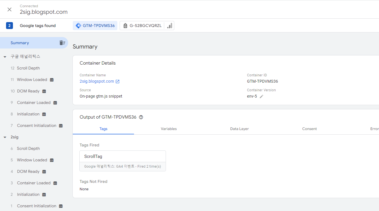 태그에서 측정 ID는 애널리틱스의 측정아이디 입력(스트림) 후 제출 - 게시 - 계속을 하고 테스트까지 완료하면 다음의 사진처럼 Tags Fired에 ScrollTag가 들어와있으면 성공한 것이다.