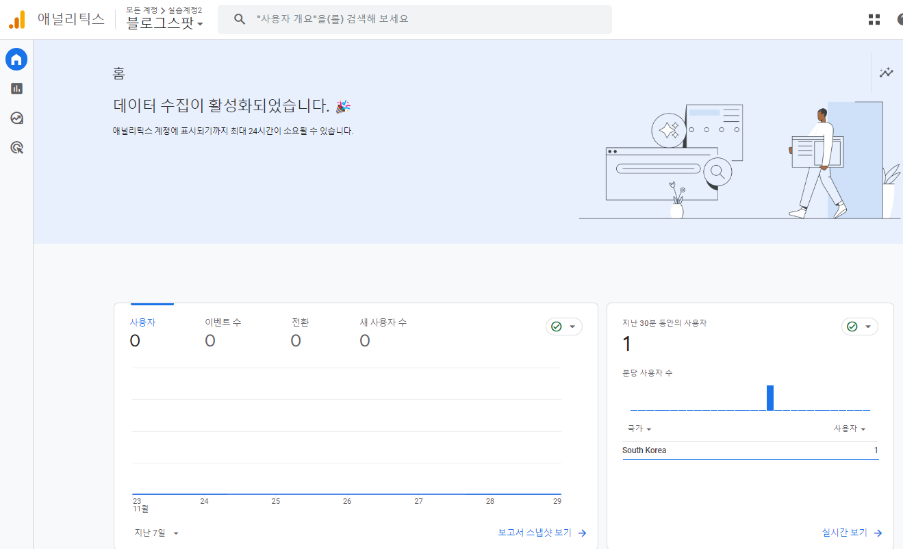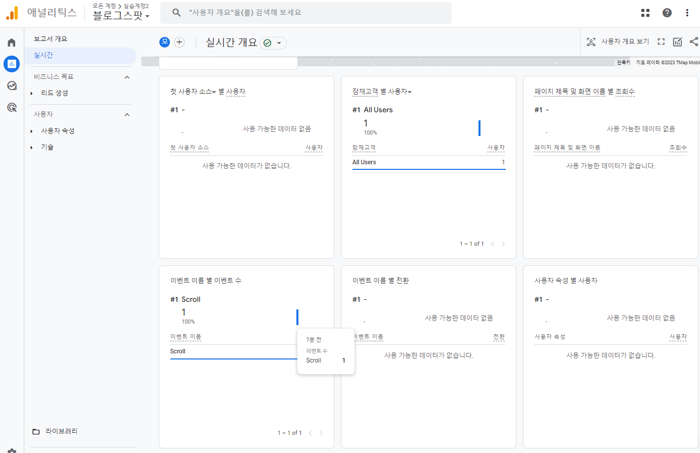 구글 애널리틱스에 들어와서 보고서 - 실시간 클릭하면 스크롤 된 흔적이 확인이 된다.