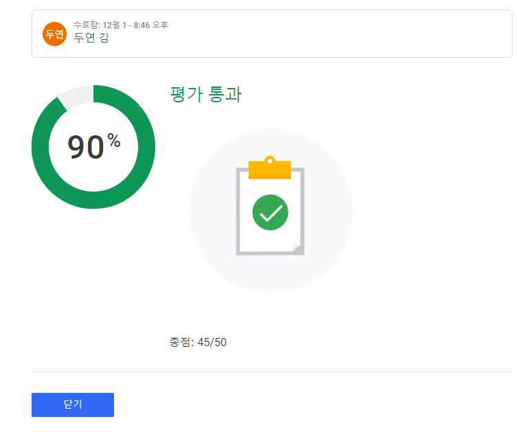 30~40분 정도 사용해서 문제를 풀었고 총 45문제를 맞춰서 " Google Analytics Certificate"를 취득!!