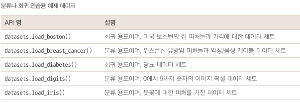 | 예제 데이터 | sklearn.datasets | 사이킷런 내장 데이터셋 |