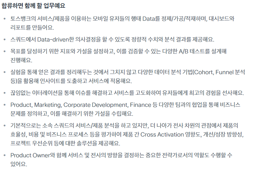 다만 아쉬운 것은 토스의 경우에는 데이터 애널리스트의 신입이 없다는 것이다.