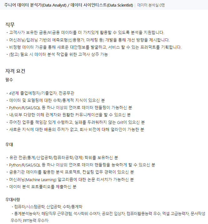 씨즈데이터는 금융과 관련된 업무를 하는 회사이다.기본적으로 통계학적 지식, 프로그래밍, 커뮤니케이션, 그릿있는 사람, 배움을 즐기는 사람 등등의 역량이 필요하다.금융기관 데이터를 활용한 프로젝트를 진행해본다면 많은 도움이 될 것이다.