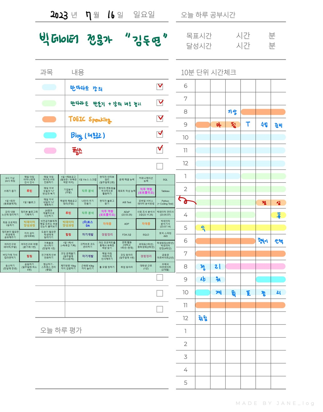 | TOEIC Speaking 공부 / 운동 / 계획표 정리 | 19:00~23:00 | TOEIC Speaking 강의 |