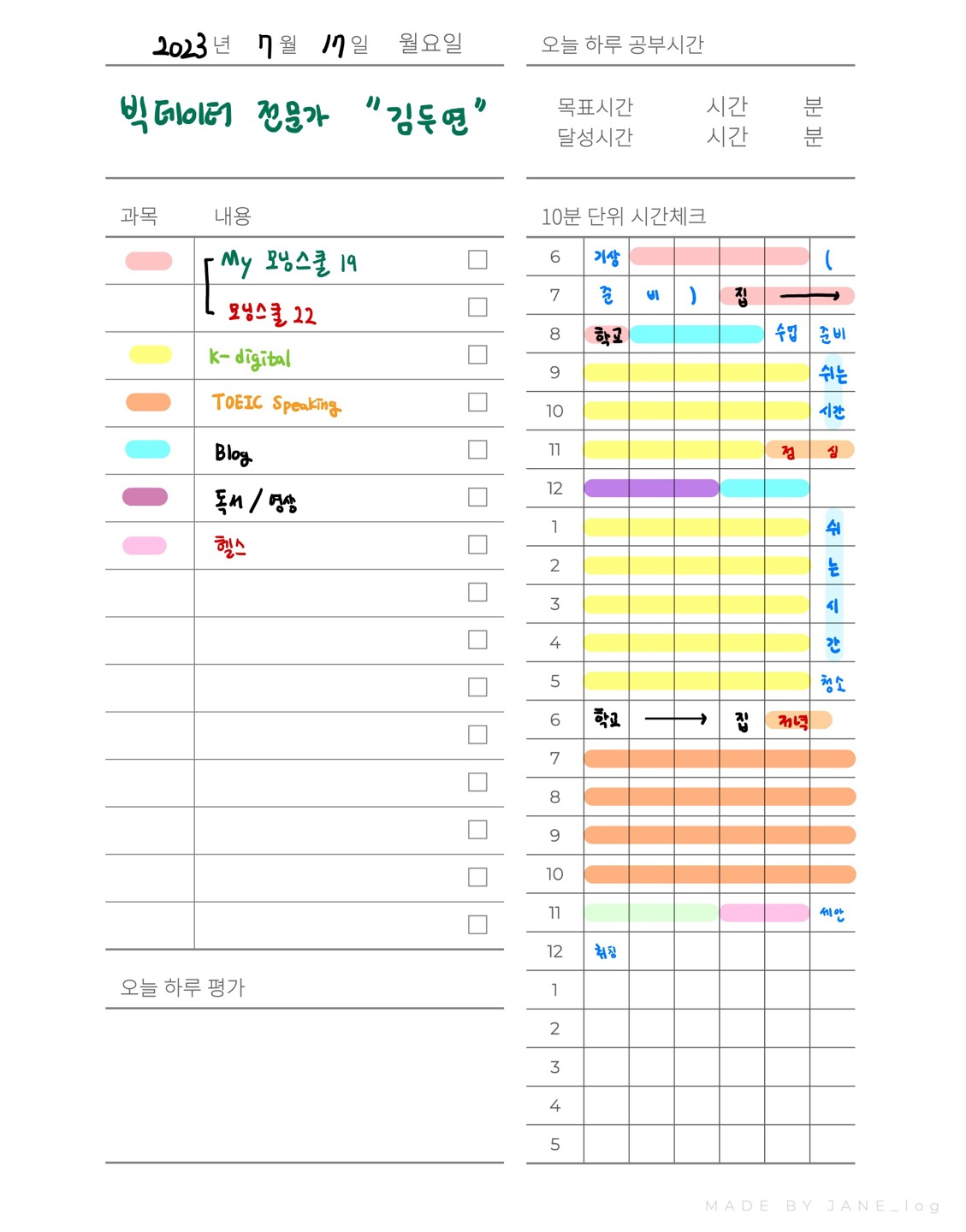 | TOEIC Speaking 복습 | 23:00~24:00 | TOEIC Speaking 복습 / 운동 |