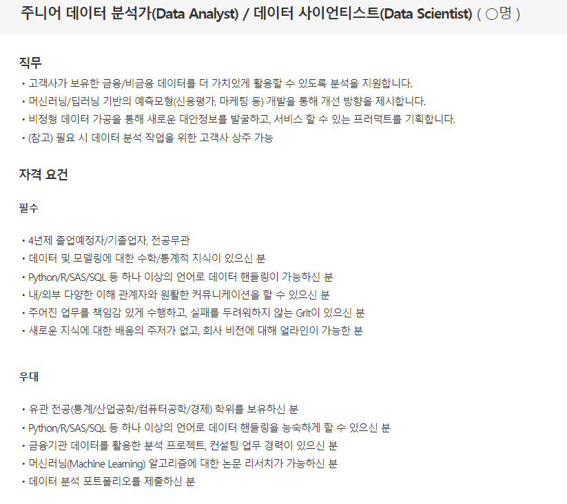 업무 : 금융/비금융 데이터 분석 / 머신러닝,딥러닝 기반의 예측모형 개발