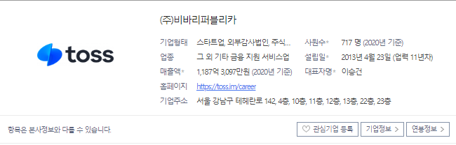 회사 : (주) 비바리퍼플리카 - 토스뱅크
