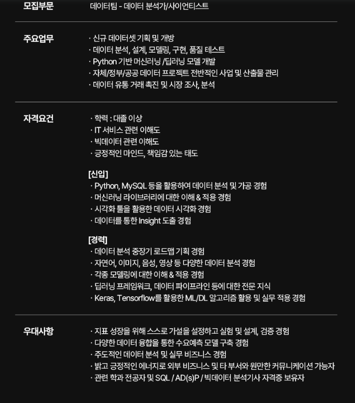 자격 요건 : Python,MySQL / ML이해도 / BI