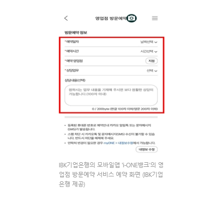 IBK기업은행이 고객이 영업점 방문을 사전 예약하고 필요한 서류를 안내받을 수 있는 \'영업점 방문예약 서비스\'를 전(全) 영업점으로 확대 시행한다고 7일 밝혔다.기업은행은 해당 서비스를 구