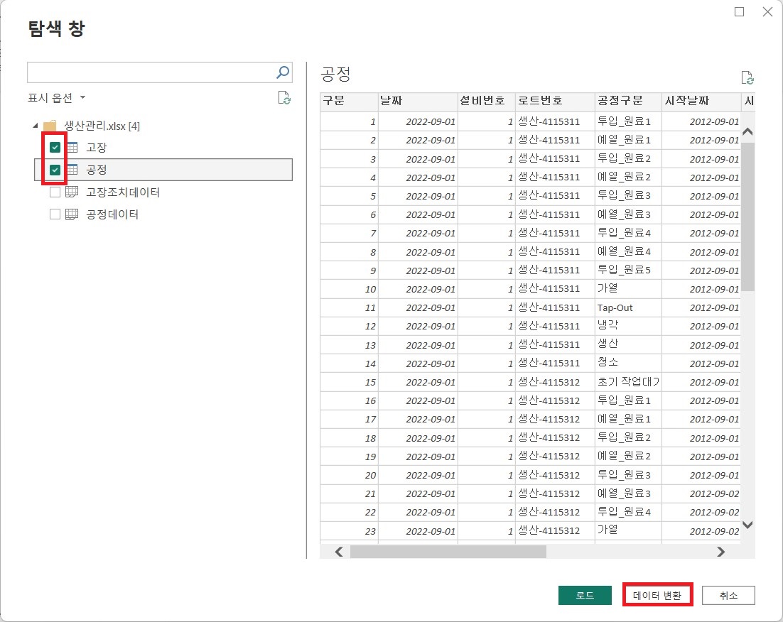 쿼리 병합을 통해서 '공정'과''고장'의 구분번호를 기준으로 병합해서 새로운 쿼리를 만들도록 해준다.