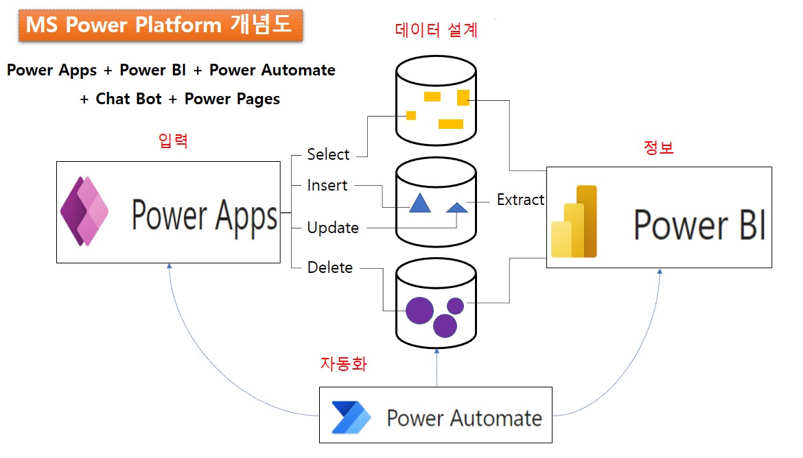 BI / Apps / Teams / Automate / SharePoint(클라우드공간) 등이 존재한다.
