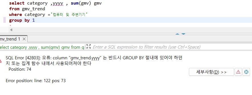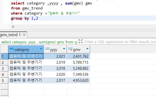 즉, category와 yyyy가 있으므로 group by에는 1,2 모두를 작성해야한다.