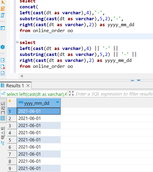 - left(cast(_ as varchar),개수) => 처음 개수